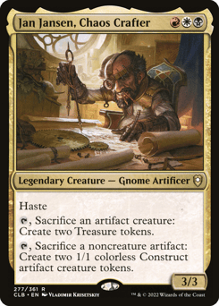 Haste {T}, Sacrifice an artifact creature: Create two Treasure tokens. {T}, Sacrifice a noncreature artifact: Create two 1/1 colorless Construct artifact creature tokens.