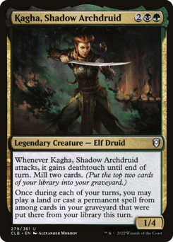 Whenever Kagha attacks, it gains deathtouch until end of turn. Mill two cards. (Put the top two cards of your library into your graveyard.) Once during each of your turns, you may play a land or cast a permanent spell from among cards in your graveyard that were put there from your library this turn.