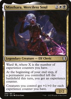 Minthara has ward {X}, where X is the number of experience counters you have. At the beginning of your end step, if a permanent you controlled left the battlefield this turn, you get an experience counter. Creatures you control get +1/+0 for each experience counter you have.