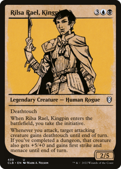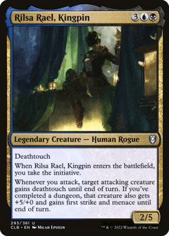 Deathtouch When Rilsa Rael enters, you take the initiative. Whenever you attack, target attacking creature gains deathtouch until end of turn. If you've completed a dungeon, that creature also gets +5/+0 and gains first strike and menace until end of turn.