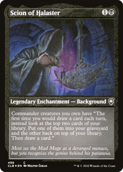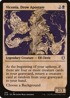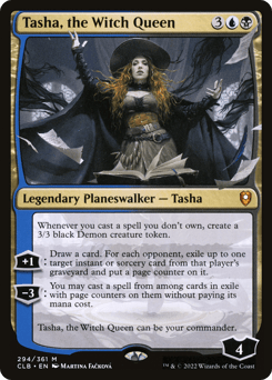 Whenever you cast a spell you don't own, create a 3/3 black Demon creature token. [+1]: Draw a card. For each opponent, exile up to one target instant or sorcery card from that player's graveyard and put a page counter on it. [−3]: You may cast a spell from among cards in exile with page counters on them without paying its mana cost. Tasha, the Witch Queen can be your commander.