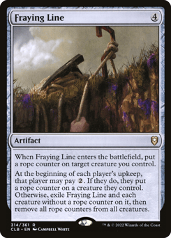When this artifact enters, put a rope counter on target creature you control. At the beginning of each player's upkeep, that player may pay {2}. If they do, they put a rope counter on a creature they control. Otherwise, exile this artifact and each creature without a rope counter on it, then remove all rope counters from all creatures.