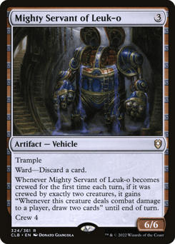 Trample Ward—Discard a card. Whenever this Vehicle becomes crewed for the first time each turn, if it was crewed by exactly two creatures, it gains "Whenever this creature deals combat damage to a player, draw two cards" until end of turn. Crew 4