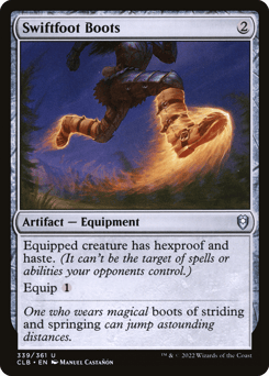 Equipped creature has hexproof and haste. (It can't be the target of spells or abilities your opponents control. It can attack and {T} no matter when it came under your control.) Equip {1} ({1}: Attach to target creature you control. Equip only as a sorcery.)