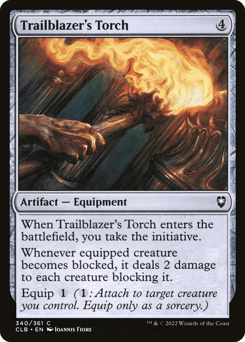 When this Equipment enters, you take the initiative. Whenever equipped creature becomes blocked, it deals 2 damage to each creature blocking it. Equip {1} ({1}: Attach to target creature you control. Equip only as a sorcery.)