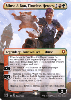 When Minsc & Boo enters and at the beginning of your upkeep, you may create Boo, a legendary 1/1 red Hamster creature token with trample and haste. [+1]: Put three +1/+1 counters on up to one target creature with trample or haste. [−2]: Sacrifice a creature. When you do, Minsc & Boo deals X damage to any target, where X is that creature's power. If the sacrificed creature was a Hamster, draw X cards. Minsc & Boo, Timeless Heroes can be your commander.