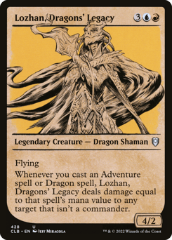 Flying Whenever you cast an Adventure or Dragon spell, Lozhan deals damage equal to that spell's mana value to any target that isn't a commander.