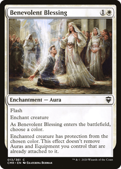 Flash Enchant creature As this Aura enters, choose a color. Enchanted creature has protection from the chosen color. This effect doesn't remove Auras and Equipment you control that are already attached to it.