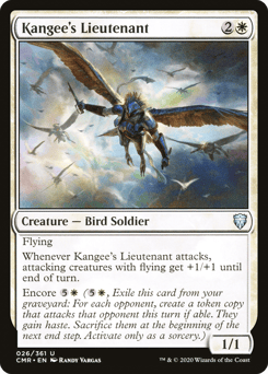Flying Whenever this creature attacks, attacking creatures with flying get +1/+1 until end of turn. Encore {5}{W} ({5}{W}, Exile this card from your graveyard: For each opponent, create a token copy that attacks that opponent this turn if able. They gain haste. Sacrifice them at the beginning of the next end step. Activate only as a sorcery.)