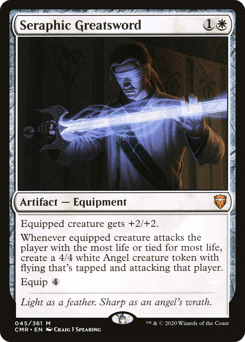 Equipped creature gets +2/+2. Whenever equipped creature attacks the player with the most life or tied for most life, create a 4/4 white Angel creature token with flying that's tapped and attacking that player. Equip {4}