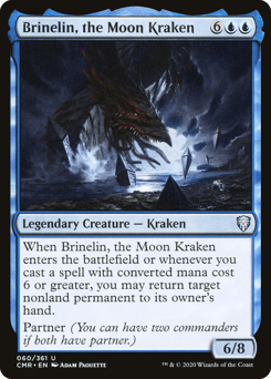 When Brinelin enters and whenever you cast a spell with mana value 6 or greater, you may return target nonland permanent to its owner's hand. Partner (You can have two commanders if both have partner.)