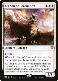Flying When this creature enters, you become the monarch. As long as you're the monarch, damage doesn't cause you to lose life. (When a creature deals combat damage to you, its controller still becomes the monarch.)