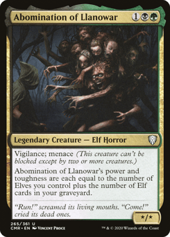 Vigilance; menace (This creature can't be blocked except by two or more creatures.) Abomination of Llanowar's power and toughness are each equal to the number of Elves you control plus the number of Elf cards in your graveyard.
