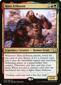 Whenever Hans Eriksson attacks, reveal the top card of your library. If it's a creature card, put it onto the battlefield tapped and attacking defending player or a planeswalker they control. Otherwise, put that card into your hand. When you put a creature card onto the battlefield this way, it fights Hans Eriksson.