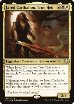 When Jared Carthalion enters, target opponent becomes the monarch. You can't become the monarch this turn. If damage would be dealt to Jared Carthalion while you're the monarch, prevent that damage and put that many +1/+1 counters on it.