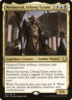 Hexproof from artifacts, creatures, and enchantments When Nevinyrral enters, create a tapped 2/2 black Zombie creature token for each creature that died this turn. When Nevinyrral dies, you may pay {1}. When you do, destroy all artifacts, creatures, and enchantments.