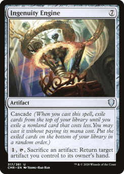 Cascade (When you cast this spell, exile cards from the top of your library until you exile a nonland card that costs less. You may cast it without paying its mana cost. Put the exiled cards on the bottom in a random order.) {1}, {T}, Sacrifice an artifact: Return target artifact you control to its owner's hand.