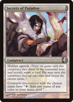 Hidden agenda (Start the game with this conspiracy face down in the command zone and secretly choose a card name. You may turn this conspiracy face up any time and reveal that name.) You may spend mana as though it were mana of any color to cast spells with the chosen name.