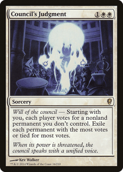 Will of the council — Starting with you, each player votes for a nonland permanent you don't control. Exile each permanent with the most votes or tied for most votes.
