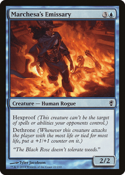 Hexproof (This creature can't be the target of spells or abilities your opponents control.) Dethrone (Whenever this creature attacks the player with the most life or tied for most life, put a +1/+1 counter on it.)