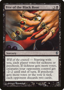 Will of the council — Starting with you, each player votes for sickness or psychosis. If sickness gets more votes, creatures your opponents control get -2/-2 until end of turn. If psychosis gets more votes or the vote is tied, each opponent discards two cards.
