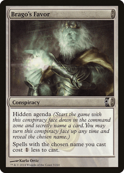 Hidden agenda (Start the game with this conspiracy face down in the command zone and secretly choose a card name. You may turn this conspiracy face up any time and reveal that name.) Spells with the chosen name you cast cost {1} less to cast.