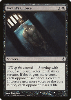 Will of the council — Starting with you, each player votes for death or torture. If death gets more votes, each opponent sacrifices a creature of their choice. If torture gets more votes or the vote is tied, each opponent loses 4 life.
