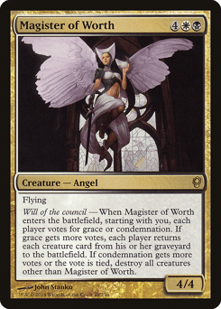 Flying Will of the council — When this creature enters, starting with you, each player votes for an artifact, creature, or enchantment card in your graveyard. Return each card with the most votes or tied for most votes to your hand.