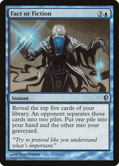 Reveal the top five cards of your library. An opponent separates those cards into two piles. Put one pile into your hand and the other into your graveyard.