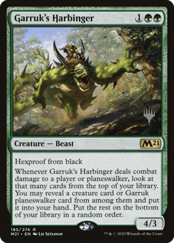 Hexproof from black Whenever this creature deals combat damage to a player or planeswalker, look at that many cards from the top of your library. You may reveal a creature card or Garruk planeswalker card from among them and put it into your hand. Put the rest on the bottom of your library in a random order.