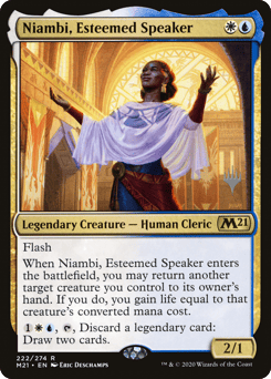 Flash When Niambi enters, you may return another target creature you control to its owner's hand. If you do, you gain life equal to that creature's mana value. {1}{W}{U}, {T}, Discard a legendary card: Draw two cards.