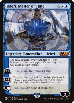 You may activate loyalty abilities of Teferi on any player's turn any time you could cast an instant. [+1]: Draw a card, then discard a card. [−3]: Target creature you don't control phases out. (Treat it and anything attached to it as though they don't exist until its controller's next turn.) [−10]: Take two extra turns after this one.