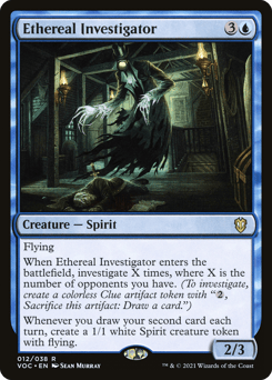 Flying When this creature enters, investigate X times, where X is the number of opponents you have. (To investigate, create a Clue token. It's an artifact with "{2}, Sacrifice this token: Draw a card.") Whenever you draw your second card each turn, create a 1/1 white Spirit creature token with flying.