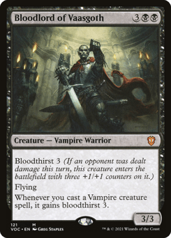 Bloodthirst 3 (If an opponent was dealt damage this turn, this creature enters with three +1/+1 counters on it.) Flying Whenever you cast a Vampire creature spell, it gains bloodthirst 3.