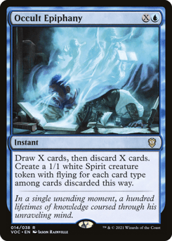 Draw X cards, then discard X cards. Create a 1/1 white Spirit creature token with flying for each card type among cards discarded this way.