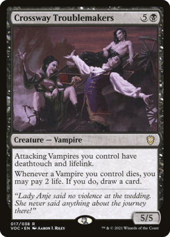 Attacking Vampires you control have deathtouch and lifelink. (Any amount of damage they deal to a creature is enough to destroy it. Damage dealt by those creatures also causes their controller to gain that much life.) Whenever a Vampire you control dies, you may pay 2 life. If you do, draw a card.