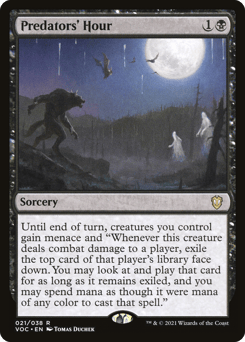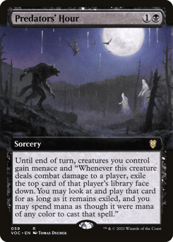 Until end of turn, creatures you control gain menace and "Whenever this creature deals combat damage to a player, exile the top card of that player's library face down. You may look at and play that card for as long as it remains exiled, and you may spend mana as though it were mana of any color to cast that spell."