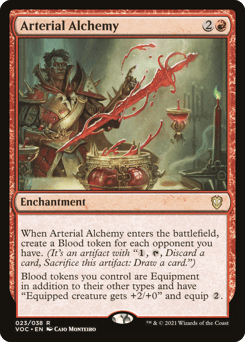 When this enchantment enters, create a Blood token for each opponent you have. (It's an artifact with "{1}, {T}, Discard a card, Sacrifice this token: Draw a card.") Blood tokens you control are Equipment in addition to their other types and have "Equipped creature gets +2/+0" and equip {2}.