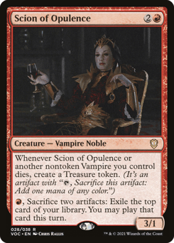Whenever this creature or another nontoken Vampire you control dies, create a Treasure token. (It's an artifact with "{T}, Sacrifice this token: Add one mana of any color.") {R}, Sacrifice two artifacts: Exile the top card of your library. You may play that card this turn.