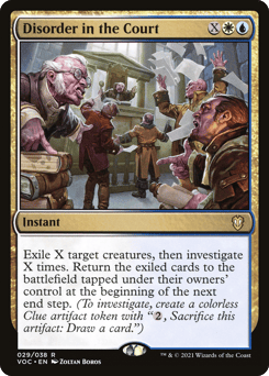 Exile X target creatures, then investigate X times. Return the exiled cards to the battlefield tapped under their owners' control at the beginning of the next end step. (To investigate, create a Clue token. It's an artifact with "{2}, Sacrifice this token: Draw a card.")