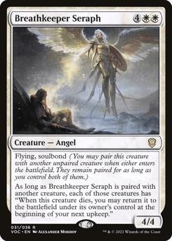 Flying, soulbond (You may pair this creature with another unpaired creature when either enters. They remain paired for as long as you control both of them.) As long as Breathkeeper Seraph is paired with another creature, each of those creatures has "When this creature dies, you may return it to the battlefield under its owner's control at the beginning of your next upkeep."