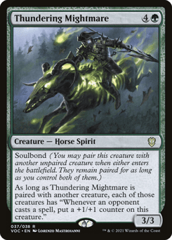 Soulbond (You may pair this creature with another unpaired creature when either enters. They remain paired for as long as you control both of them.) As long as Thundering Mightmare is paired with another creature, each of those creatures has "Whenever an opponent casts a spell, put a +1/+1 counter on this creature."
