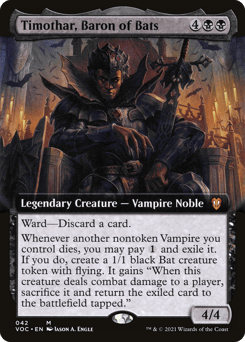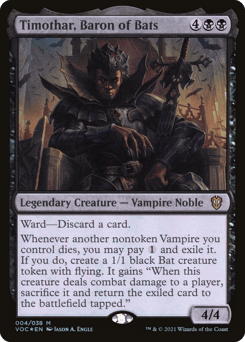 Ward—Discard a card. Whenever another nontoken Vampire you control dies, you may pay {1} and exile it. If you do, create a 1/1 black Bat creature token with flying. It gains "When this token deals combat damage to a player, sacrifice it and return the exiled card to the battlefield tapped."