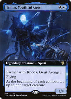 Partner with Timin, Youthful Geist (When this creature enters, target player may put Timin into their hand from their library, then shuffle.) Vigilance Whenever a creature an opponent controls becomes tapped, if it isn't being declared as an attacker, put a +1/+1 counter on Rhoda.