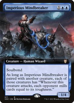 Soulbond (You may pair this creature with another unpaired creature when either enters. They remain paired for as long as you control both of them.) As long as Imperious Mindbreaker is paired with another creature, each of those creatures has "Whenever this creature attacks, each opponent mills cards equal to its toughness."