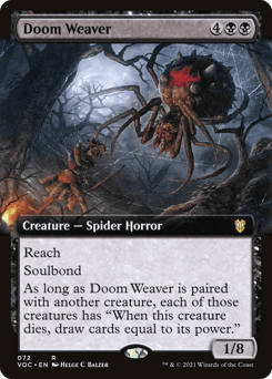 Reach Soulbond (You may pair this creature with another unpaired creature when either enters. They remain paired for as long as you control both of them.) As long as Doom Weaver is paired with another creature, each of those creatures has "When this creature dies, draw cards equal to its power."