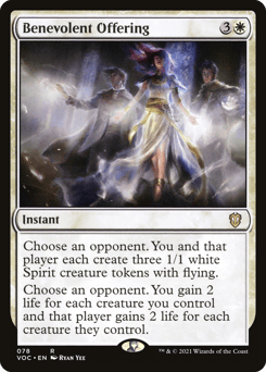 Choose an opponent. You and that player each create three 1/1 white Spirit creature tokens with flying. Choose an opponent. You gain 2 life for each creature you control and that player gains 2 life for each creature they control.