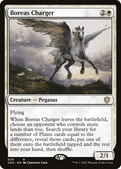 Flying When this creature leaves the battlefield, choose an opponent who controls more lands than you. Search your library for a number of Plains cards equal to the difference, reveal those cards, put one of them onto the battlefield tapped and the rest into your hand, then shuffle.