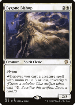 Flying Whenever you cast a creature spell with mana value 3 or less, investigate. (Create a Clue token. It's an artifact with "{2}, Sacrifice this token: Draw a card.")