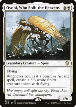 Flying Whenever you cast a Spirit or Arcane spell, create a 3/3 white Spirit creature token with flying.